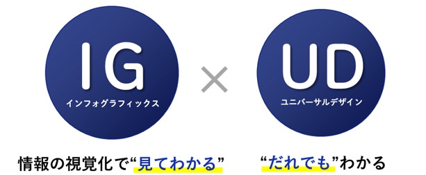 IGUDは、だれでもわかるユニバーサルデザイン(UD)の考えをベースに、必要に応じて、見てわかるインフォグラフィックス(IG)を融合させ、コミュニケーションを最適化する、DNP独自のデザインメソッドです。