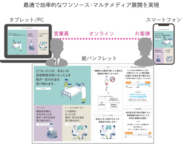 パンフレットの使い方や話法に合わせてコンテンツを再設計。紙パンフレットのコンテンツをデジタルに最適なフォーマットにリメイクすることができます。コンテンツ視点を優先して制作することで、同じコンテンツを展開させ、クリエイティブの統一・制作負荷の軽減が可能となります。