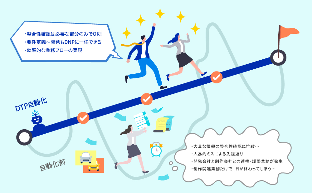 ・DTP修正を自動化することで、修正時間を短縮しながらも品質向上を実現!
