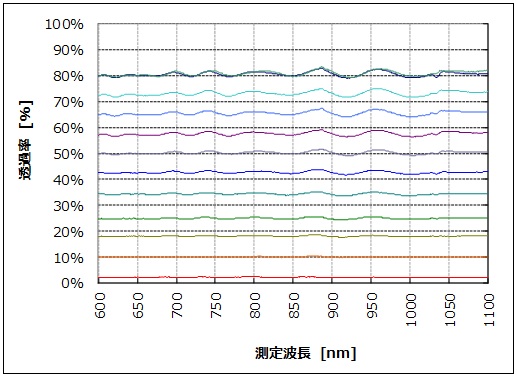 透過タイプ階調チャートにおける、可視光から近赤外領域(NIR)の分光透過率測定結果です。