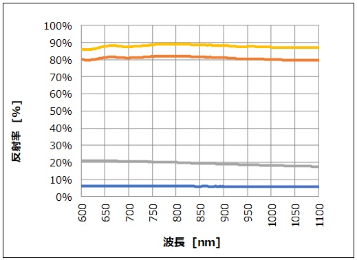 反射タイプチャートにおける、可視光から近赤外領域(NIR)の分光反射率測定結果です。