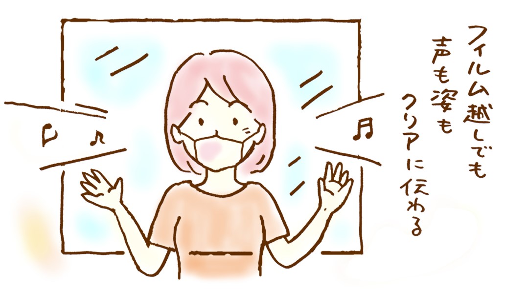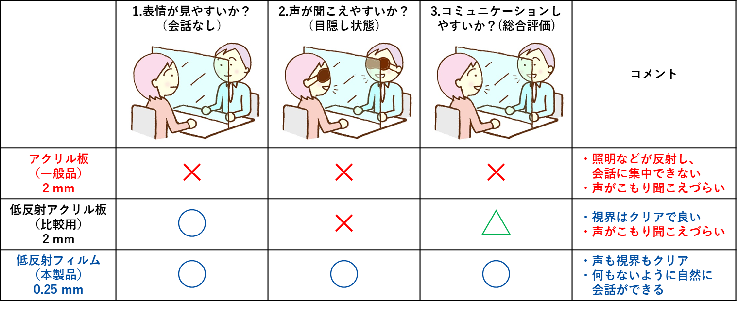 また、一般的なアクリル板などのパーティションに比べ薄いことに加え、視覚の効果により、声が聞こえやすく、会話がしやすくなるという効果も確認できました。