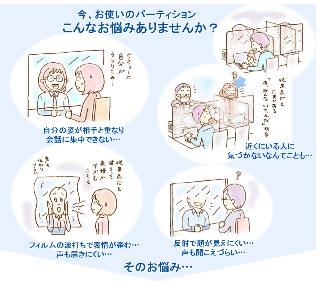 液晶ディスプレイに用いられている低反射フィルムを活用し、開発したフィルムパーティションです。 一般的なアクリルパーティションよりも薄いフィルムであることに加え、視界がクリアになることで相手の表情がよく見え、声がよく聞こえることが特徴です。 ニューノーマル社会における新しいコミュニケーションツールとして、安心で快適なフィルムパーティションを提供します。