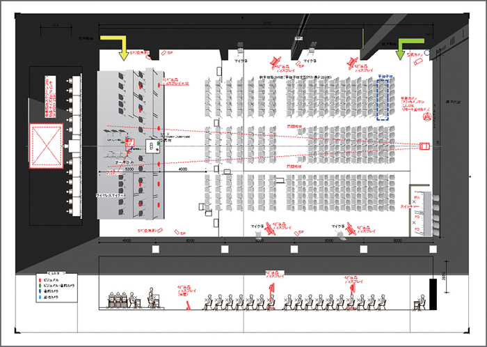スムーズな株主総会の進行のため、役員動線・株主動線など、人の動きに配慮した上映システムを設計・構築します。また、会場図面・系統図・CGイメージなどを活用し、テスト上映を含む万全なサポート体制を提供しています。第2会場、各拠点への中継なども豊富な実績に基づき安心・安全の対応を実現します。また、近年需要の高まっている「ライブ配信」についても、映像技術部門を社内に持つ当社の強みを発揮し、委託先各社と連携することで総会集中時期も万全な体制でサポートします。