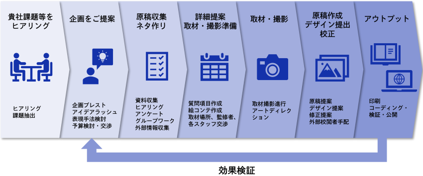 企画立案、素材収集、取材撮影、記事の制作校正手配等、制作に必要な作業の全てをお任せいただけます。