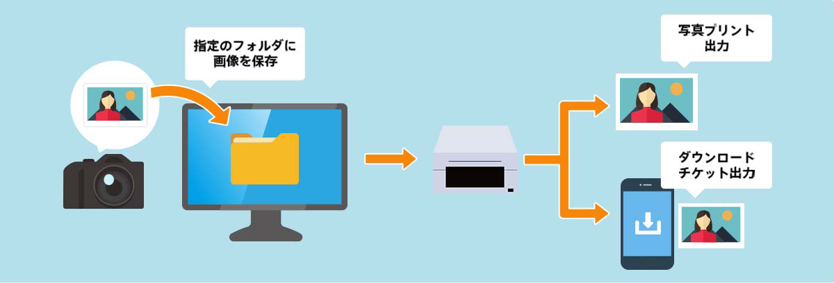 簡単なオペレーションでお客さまを待たせることなく写真プリントと画像データを提供できます。指定のフォルダに撮影画像が保存されるように設定するだけで、フレーム合成から写真プリント出力、サーバーへのアップロードや画像データのダウンロードチケットの出力まで行うことができます。必要なソフト用ドングル、ルーター、サーバー利用がセットになったレンタルモデルです。