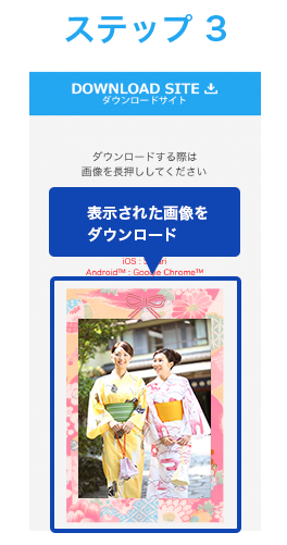簡単3ステップで、お客さまのスマートフォンに撮影画像データを保存できます。撮った画像をお客さまがSNSでシェアすることで、観光地やイベントの認知度もアップします!
