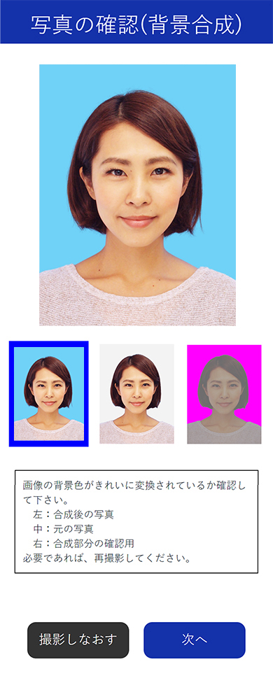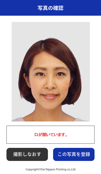 撮影された顔写真はサーバーにアップされる前にAI機能によって規格に沿っているか判定します。規格を満たしていない場合は再撮影を促しますので、規格外の写真がアップロードされるのを未然に防ぎます。 |
