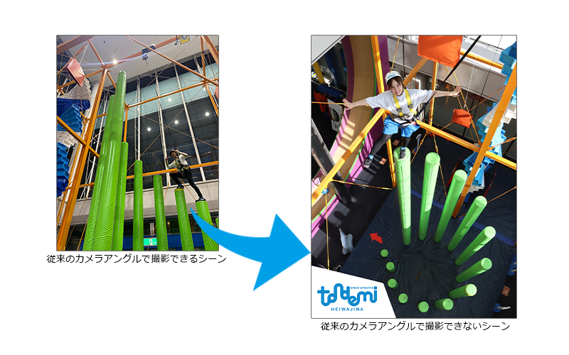 自分では撮ることのできないアングルから、オートシャッターで臨場感のある写真を撮影し写真プリントや画像データを販売できるシステムです。