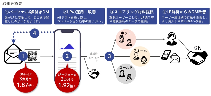 LPのアクセス解析結果をDMのクリエイティブ設計に活かすことで、DMからLPへの流入率とLPからの送客率の双方を改善。 |
