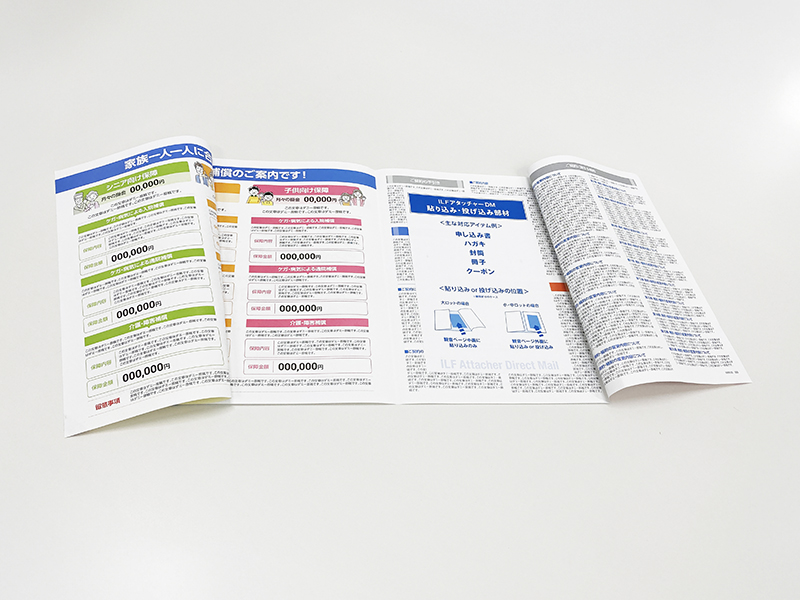 ILFアタッチャーDMは、観音折りやA3二つ折り(A4サイズ)のパンフレット型DMに、申込書や封筒、ハガキ、クーポンなどをスマートにアタッチ(貼付)できるオールインワンDMソリューションです。インラインフィニッシングによる一貫生産で、大ロット・短納期にも対応。情報量の多いDMでも、開封後すぐにアクションを促す構成で、レスポンス向上に貢献します。