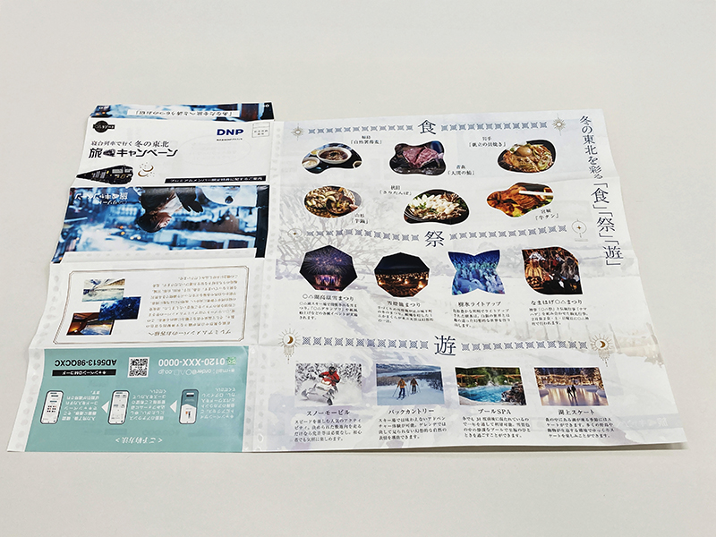 封筒とリーフレットが一体化したダイレクトメールです。開封すると、大判の広告面が一気に展開され、視覚的インパクトと情報量の両立を実現。