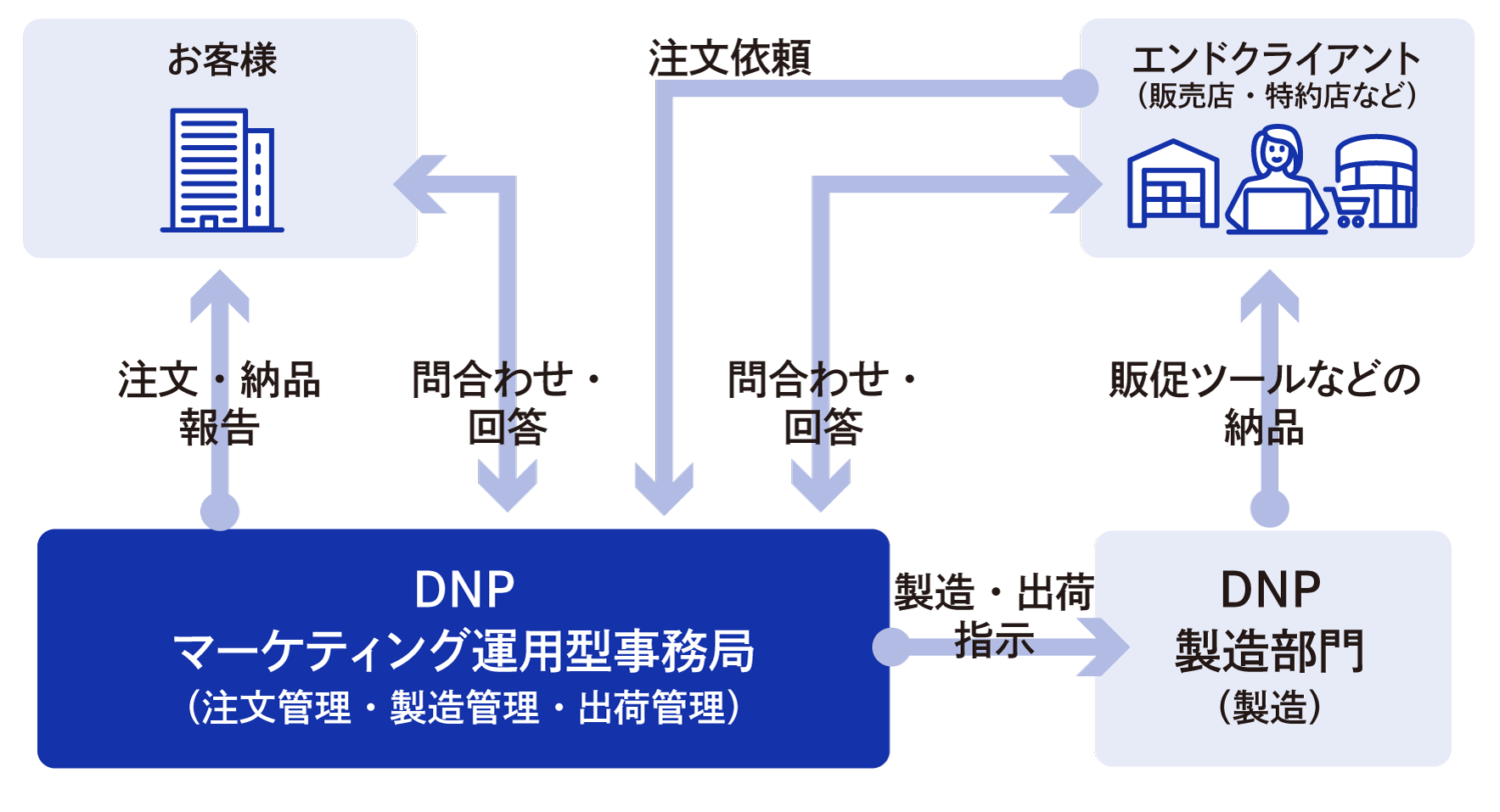 これまでお客様が行ってきた管理業務やコールセンター、データ運用などのバックオフィスBtoB業務をDNPが一括して承ります。案件ごとに個別の事務局を開設し、DNPの多様な機能・サービスを組み合わせ、全国にあるDNPの拠点を活用して最適な業務プロセスを設計します。