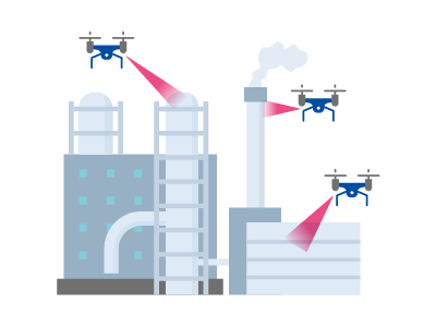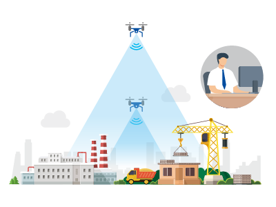ビルや工場などの敷地を高層から広範囲で監視。加えて中層での巡回など複数のドローンを活用することでより高精度な監視を行うことができます。ドローンポートを設置することで遠隔監視業務も可能です。