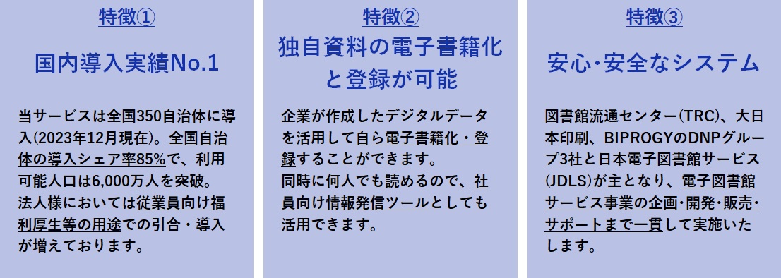 インターネットを介し、「電子書籍」や「法人様が作成された文書・動画(独自資料)」等の検索や閲覧を可能にするサービスです。 社員やその関係者向け「社内報」、特定の組織や会員向け「機関誌」などの情報提供の他、人材育成を目的とした「リスキリング」や「自己啓発」、社員とその家族向け出産・育児・介護などの「ライフサポート」、会員向け読書会などの「イベント」のための情報やリソースの提供にご活用いただけます。