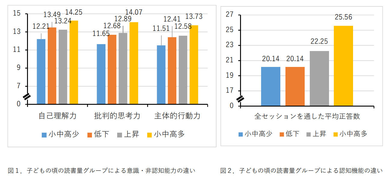 成人を対象とした調査において、子どもの頃※1の読書量が多い人は、そうでない人よりも意識・非認知能力や認知機能が高い傾向があるという調査結果があります(図1・図2)。一方で、 無書店自治体は全国で27%を超え※2、本と触れ合う機会が大幅に減少している現実があります。子どもたちが等しく読書に親しむ環境整備は、社会として取り組むべき大きなミッションであり、気軽に本に触れる場として学校図書館の存在は大きいと言えます。