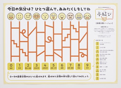 今日の気分にあった顔文字を一つ選び、あみだくじに挑戦することで0~9の図書分類の1つに辿り着きます。該当の分類の本を図書室で探して読んでみることで、普段行かない本棚へ行く機会や図書分類の存在を知る機会になります。