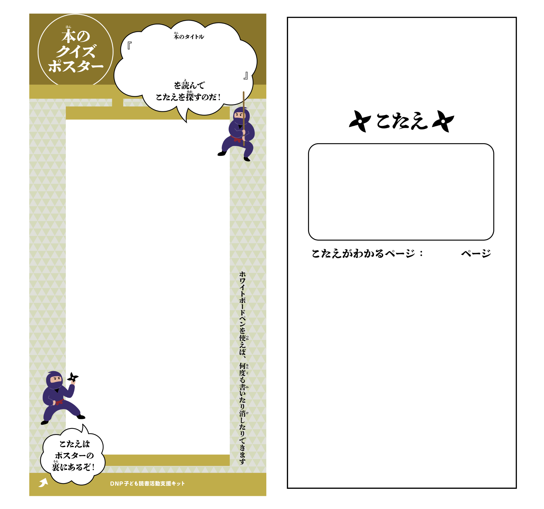 本のクイズを考えたり解いたりするゲーム感覚のレクリエーションツールです。ポスターの表面には問題が、裏面には答えが書けるようになっており、ホワイトボードペンを使うことで何度でも書いたり消したりできます。クイズを作ることで、その本について深く考える機会が増え、子どものオリジナリティを引き出すことができます。また、本から答えを探すことで、本の読み方を学び、調べ学習にも役立ちます。