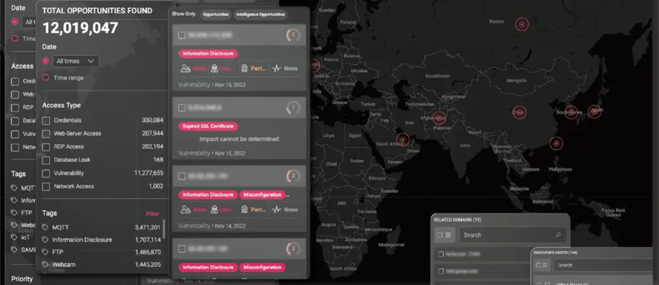 対象となる企業のドメイン名やIPアドレスをもとに、サイバー攻撃者に悪用される可能性の高いIT資産情報及び脆弱性を自動的に検出し、攻撃対象領域を可視化します。