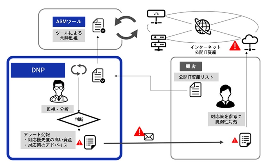 DNPでは、自社の情報セキュリティ強化の一環として実践している公開IT資産のセキュリティ監視業務をお客さま向けの支援サービス(MSS)として提供しています。セキュリティのユーザー企業としての実践経験とノウハウをもとに、お客さまの公開IT資産をASMツールを用いて監視し、攻撃リスクを検知した際は、対策例の情報とともに通報し、適切な対処を促します。本サービスを利用することで、ASMツールの運用に必要な人的リソースを外部から確保し、セキュリティ維持に求められる効果的な運用を実現することができます。