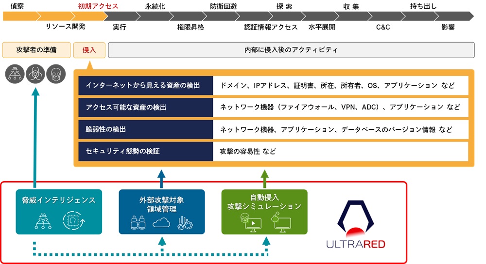 組織に内在する脆弱性の有無と侵入されるリスクを管理するためのクラウドサービスです。公開情報やダークウェブ等の脅威情報をもとに、企業のAttack Surface(攻撃対象領域)を検出し、サイバー攻撃者が実際に用いる手法で攻撃シミュレーションを行います。攻撃者の視点でリスクを数値化することで、リスクの高い脆弱な箇所を正確に特定し、サイバー攻撃に先んじて対策を講じることが可能となります。
