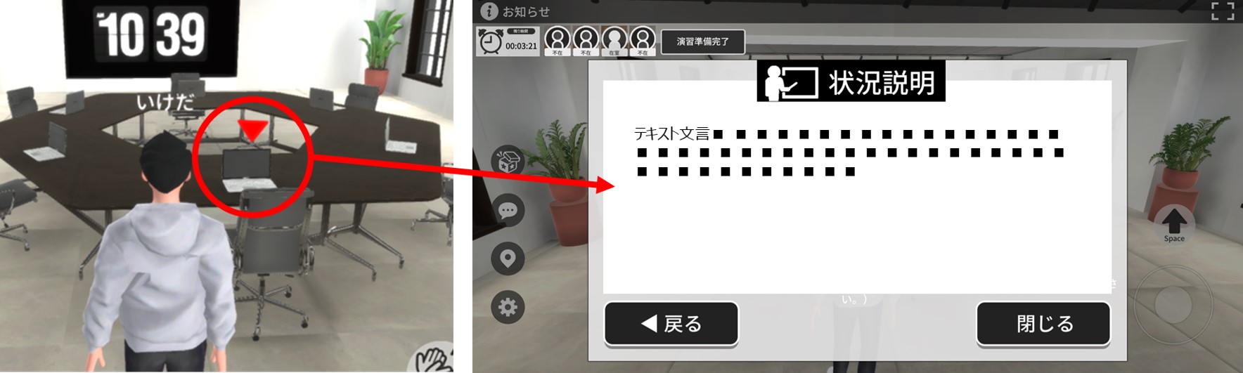 「シナリオ体験」では、それぞれの役割に割り当てられた参加者が、さまざまな課題やイベントをその役になりきって解決・達成していきます。各参加者は、ボイスチャット機能を活用して互いにコミュニケーションを取りながら、協力してシナリオを進めていきます。