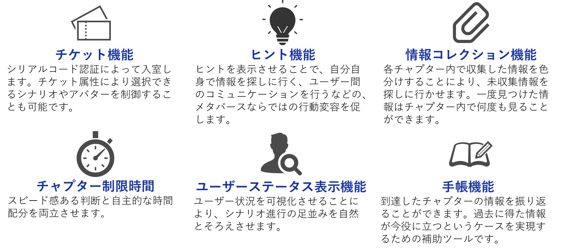 「チケット機能」は入室制限やシナリオの調整を可能にし、迅速な判断と自主的な時間管理を促す「チャプター制限時間」や、参加者の進捗を揃える「ユーザーステータス表示機能」など多くの機能があり、学習体験を豊かにします。