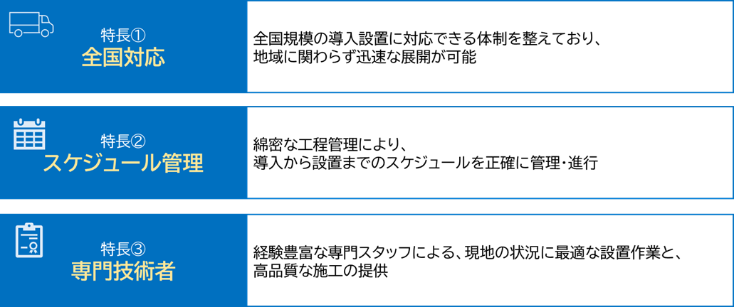 全国を幅広く網羅する体制と、経験豊富な専門スタッフによる現場対応力により、短期間での確実な導入を実現します。