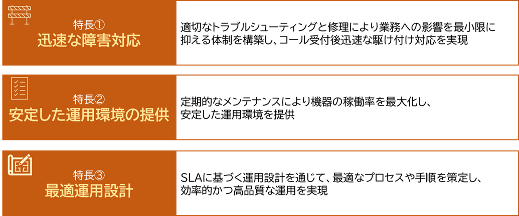 インシデント管理を含む統合サポート、IT機器のダウンタイムの極小化を図るための有効な運用設計により、機器の安定稼働を支援します。