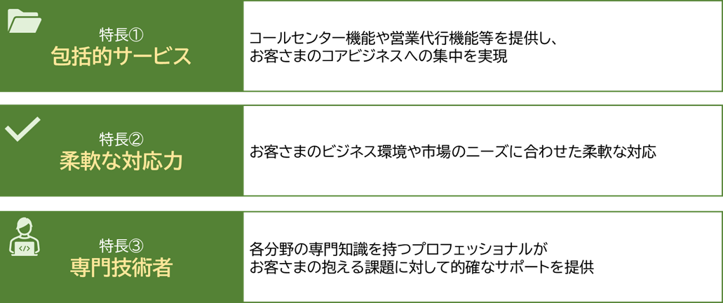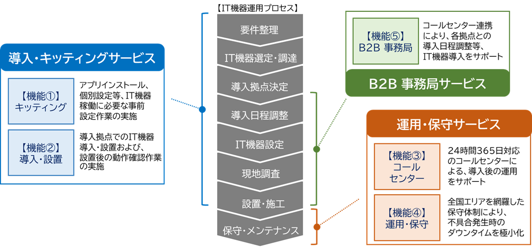 進行管理や、インバウンド業務やアウトバウンド業務等、複雑、煩雑なノンコア業務への負担を軽減し、IT機器導入・運用を成功に導きます。