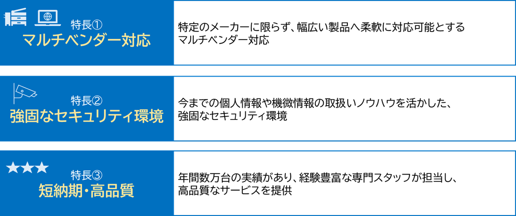マルチベンダー対応や、高いセキュリティ管理体制、業務に応じた柔軟なカスタマイズ等、長年にわたる業務で培ってきた知見や経験を活かし、スピーディな業務の立上げを可能にします。