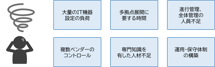 複数拠点への大量機器導入を短期間で効率的に実施したプロジェクトや、保守・運用の一例です。