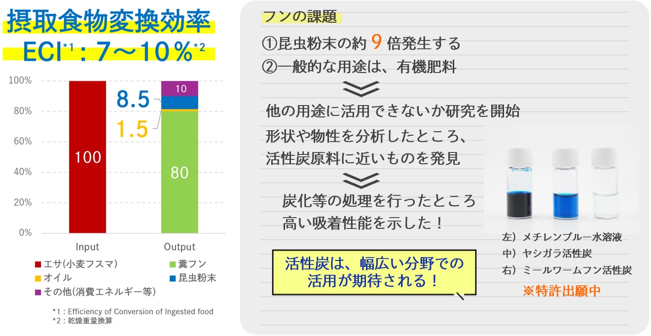 さらに、飼育過程で生じる副産物(フンやオイル)にも着目し、それらを高付加価値素材として活用することで、環境負荷の低減と経済的価値の創出を両立させます。生産されるミールワーム粉末の約9倍(乾燥重量比)も出る大量のフンは、吸着性が高く、空気や水をきれいにするフィルターとして広く用いられている活性炭へと変換できることも明らかになっています。このような取り組みにより、DNPは水産養殖業界に向けて、安定的かつ持続可能な飼料原料の供給を可能にする新しい選択肢を提供していきます。