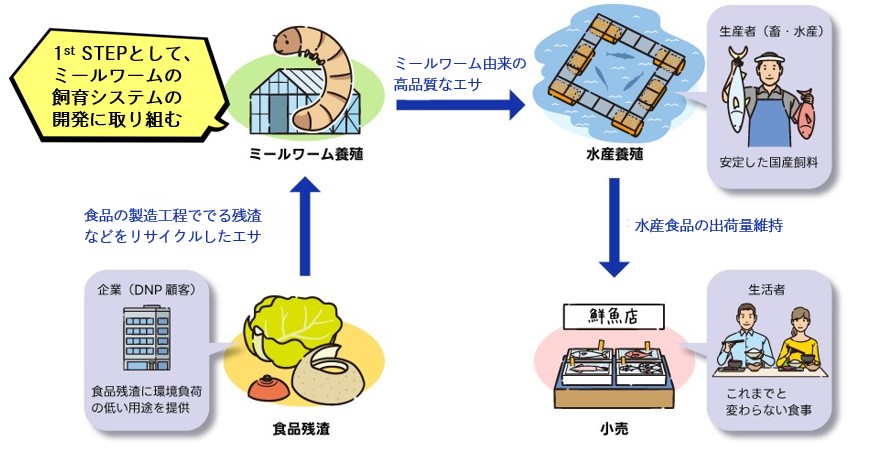 このビジネスモデルは、単なる昆虫の養殖にとどまらず、飼育技術、装置、種苗、食品残渣のネットワークを組み合わせた循環型の生産体制を構築することにあります。DNPは、食品メーカーや水産養殖業者と連携し、食品残渣を活用した飼育資源の安定供給を図るとともに、ミールワームの養殖から製品加工までを一貫して担うことで、品質と生産量の両立をめざします。