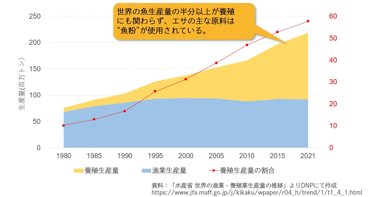 現在、日本の飼料自給率は25%(植物性も含む)にとどまり、養殖魚用飼料の主な原料として魚粉が使われており、その多くが天然魚に依存しています。世界的な人口増加や環境問題、さらにはロシア・ウクライナ情勢などの影響により、養殖魚の飼料(エサ)として主に用いられている魚粉の需要は増加し、価格も高騰しています。輸入依存の体制では、安定的な供給が困難となり、買い負けによる供給不安が顕在化しています。こうした背景のもと、DNPは「日本の食の不安を解消するために、昆虫による動物性飼料原料の国産化を実現する」ことをめざしています。これは、持続可能な食料供給体制の構築に向けた重要な取り組みであり、国内の水産養殖業界にとっても大きな意義を持つものです。