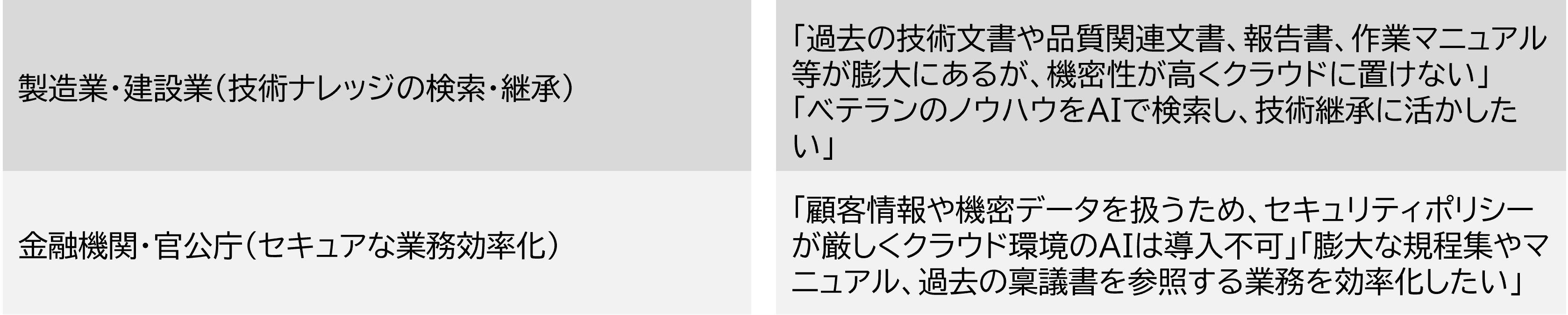 機密情報や個人情報を取り扱う業務が多く、クラウド環境の生成AIサービスを導入できない