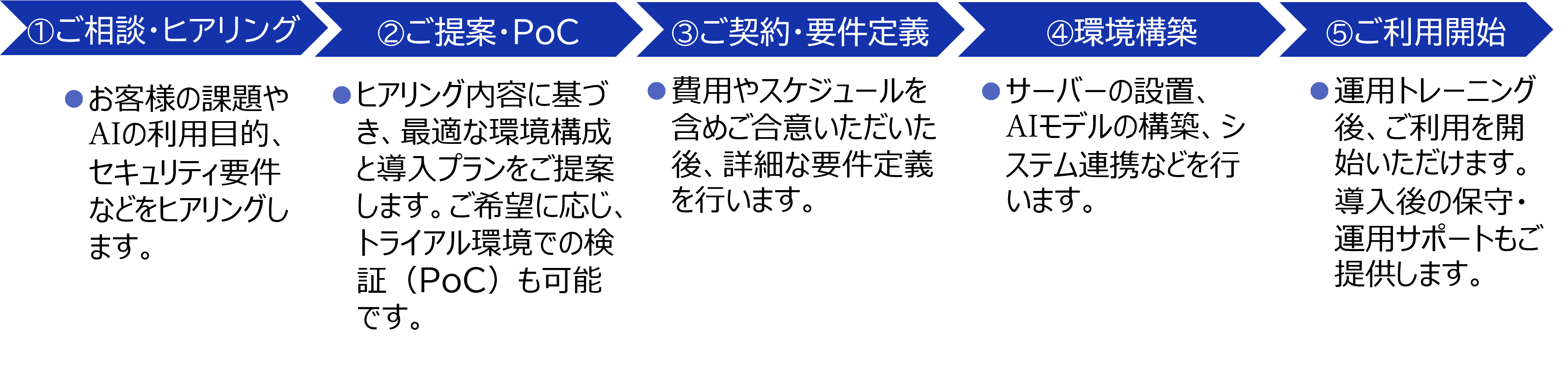 AIエンジニアや構造化スペシャリストが、お客様のAI利用目的に即した環境要件の設計から、サーバー等の機器調達・設置、AIモデルの構築、PoC(トライアル)支援、既存システムとの連携、セキュリティ設計、運用マニュアル作成、トレーニング、保守・運用まで、一貫してサポートします。