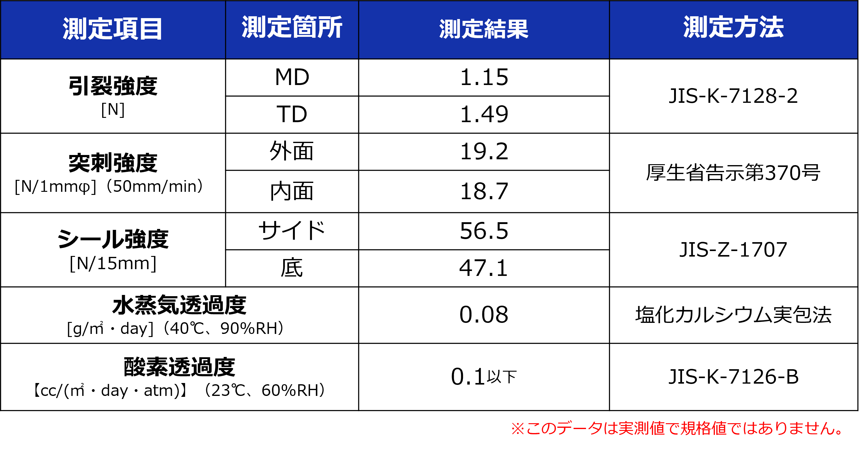 DNP社内で実測した引裂強度、突刺強度、シール強度、水蒸気透過度、酸素透過度に関する測定値を示しております。