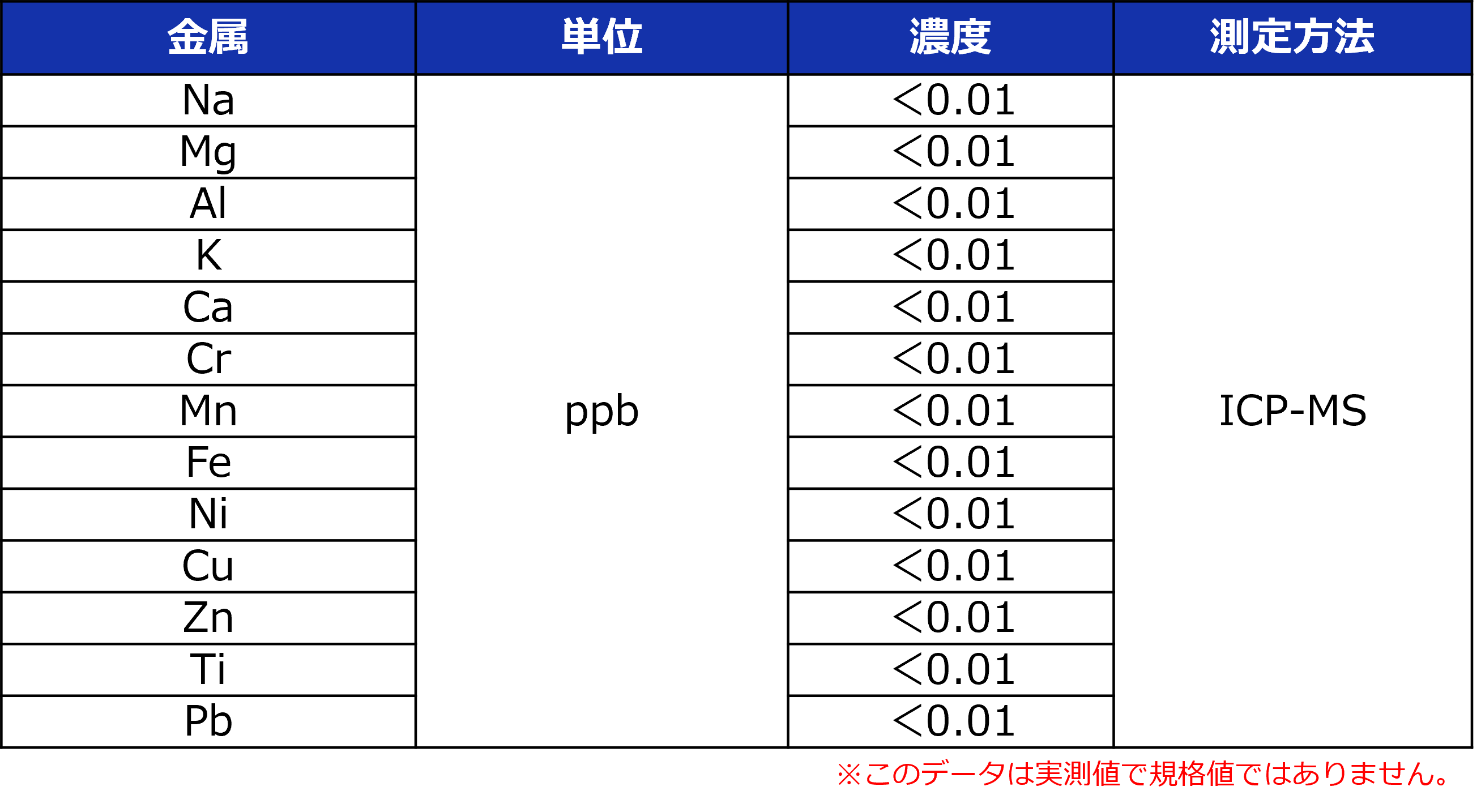DNP社内で実測したメタルイオンに関する測定値を示しております。