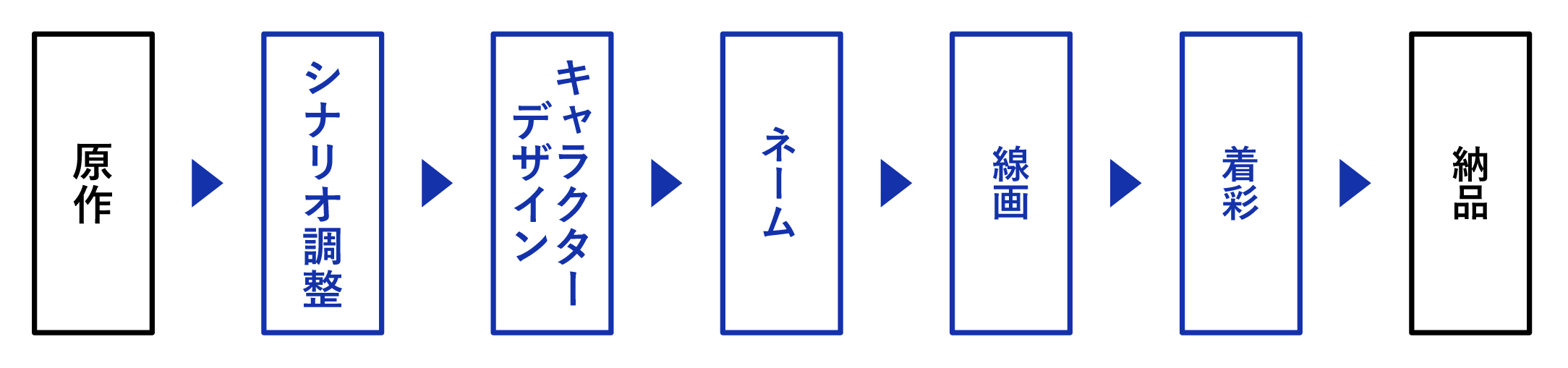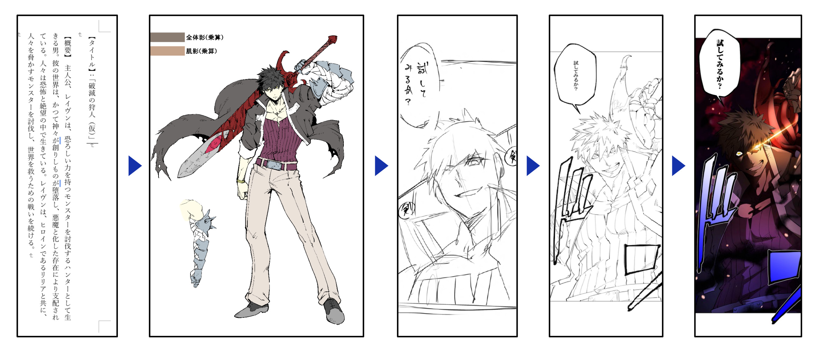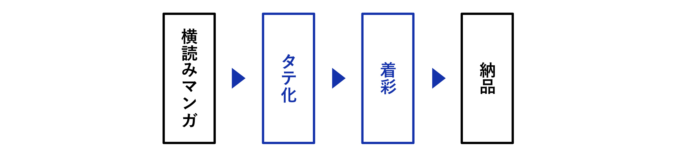 原作を元にネーム、線画、着彩などの工程を経て、縦スクロールマンガに仕上げます。
