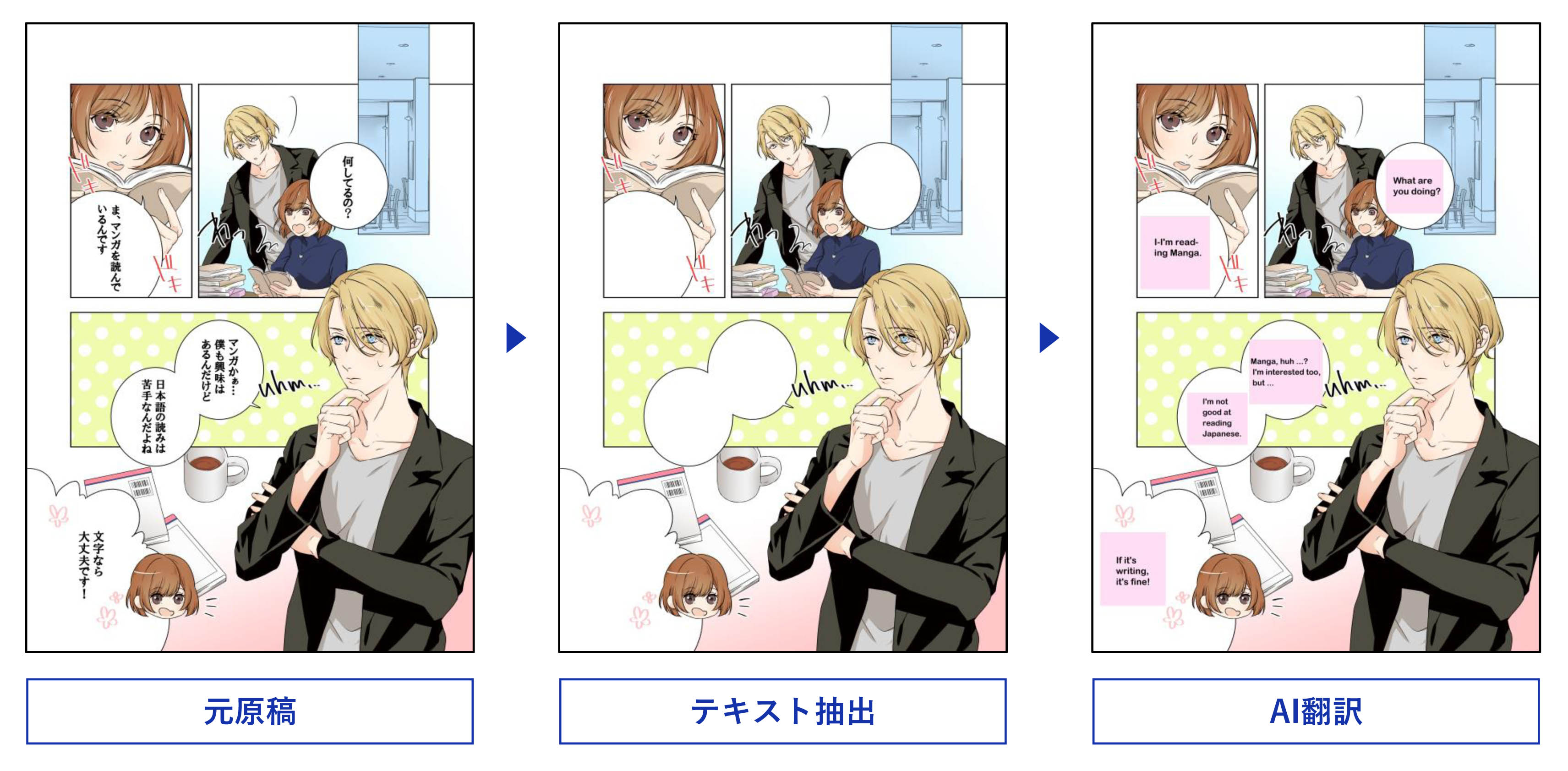 ソース言語となるマンガ原稿からテキストを抽出し、マンガ翻訳専用のAIモデルを使い自動で翻訳、レイアウトが可能です。