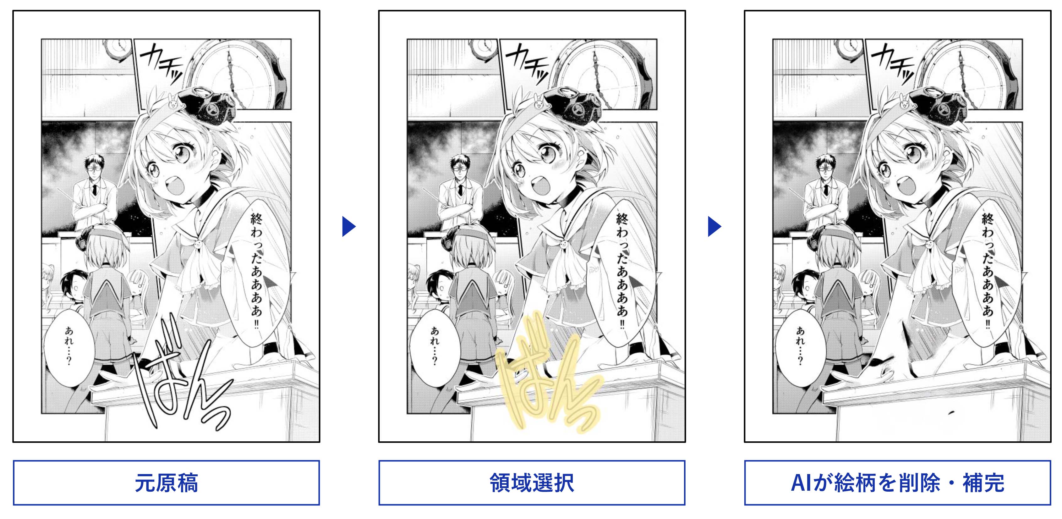 マンガ絵柄内のテキストやオノマトペなどの翻訳に不要なテキストオブジェクトをSOTA(State of the Art)AIモデルを使用して削除することができます。