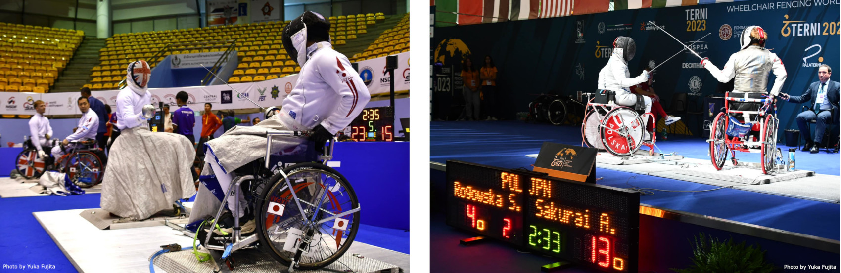 ピストと呼ばれる専用の土台に各選手専用の車いすを固定して斜めに向かい合い、腕を伸ばすと剣先が相手の肘辺り届く距離に審判員が調整して試合を行います。フェンシング同様、種目はフルーレ、エペ、サーブルの3種目で個人戦と団体戦がそれぞれあり、ルールや武器、防具も共通ですが、車いすフェンシング特有ルールについてはWorld Abilitysport【旧称:国際車いす・切断者スポーツ連盟(IWAS)】が設ける規定に準じています。選手は上体や重心を前後に動かせるよう車いすの片側(剣を持たない方)に持ち手が装着されていますが、上体が椅子から離れると反則になります。選手は障がいの程度によってクラスが分かれ、下肢の切断や麻痺などの障がいで体幹バランスが取れるクラスAと、下半身不随など体感バランスが取れないクラスB、四肢麻痺により利き腕に障がいがあるクラスCの3つに分けられて競技を行います。 ※パラリンピック競技はクラスA、Bの2クラスのみ。