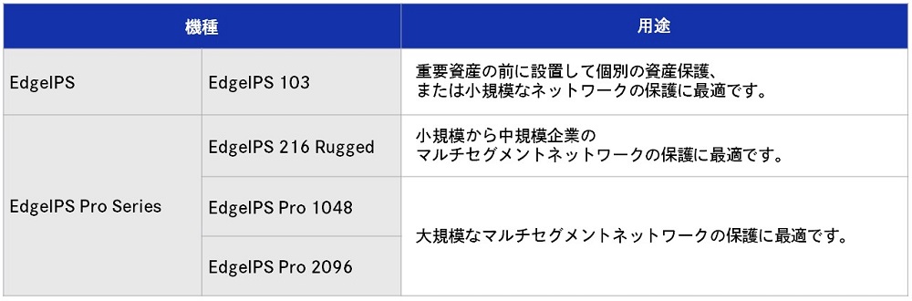 OT環境に特化したネットワークの防御を実現するソリューションです。 ネットワークセグメンテーションによる柔軟なネットワーク分離の実現と、仮想パッチ技術によるレガシー端末の脆弱性を保護することで、生産性の維持を実現します。資産情報、利用されているプロトコル情報を可視化し、環境や用途に合わせ、さまざまなレベルで細かく通信制御を行うことができます。 設置するレイヤーや帯域に応じて、次世代IPSである『EdgeIPS/ EdgeIPS Pro Series』と 次世代ファイアウォールである『EdgeFire』から、お選びいただけます。