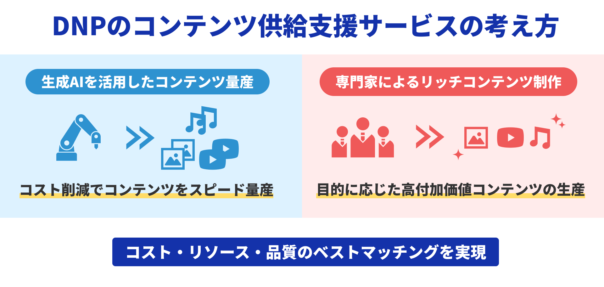DNPは「生成AI」と「高度専門家人材」のベストマッチングで、「コスト・リソース・品質」の課題を解消しながら、記事の安定的な大量投入を可能にします。