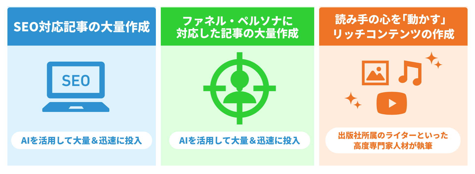 | 量産型 | SEO対応記事の大量作成 | ・SEO対策のコツを学習させたAIを活用して、コストを抑えながら大量、迅速にコンテンツを制作します 例:ニュース記事、SEOコンテンツなど |