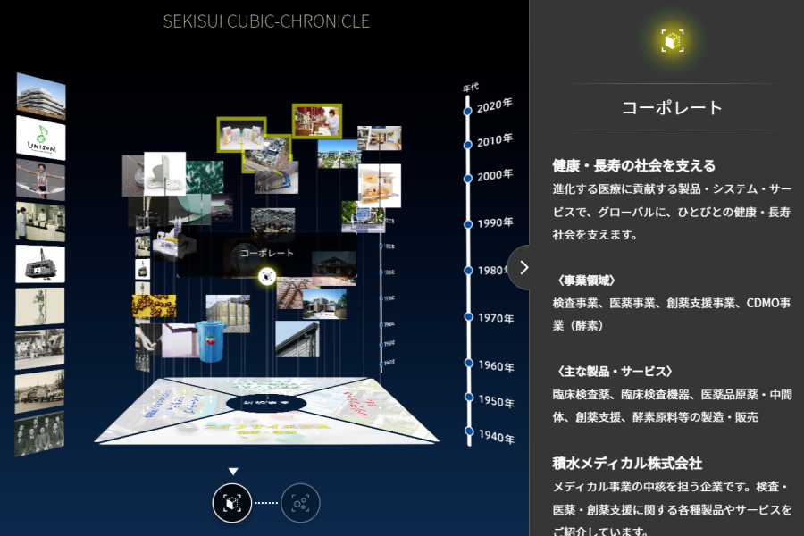みどころキューブは、会社の沿革や商品・サービス情報をキューブ(立方体)状のインタフェースを通して、テーマや関係性などの多様な視点から紹介できる情報可視化ツールです。 仮想空間のキューブを動かしながら情報を自由に閲覧できるため、利用者の興味・関心を喚起しながら理解を促すことができます。DNPが過去の知見やノウハウをもとに独自開発したもの(特許取得済み)で、ブランディング目的で会社の歴史や事業領域を紹介したり、マーケティング目的で商品選びのツールとするなど、社内外への新しいコミュニケーション手段としてご利用いただけます。