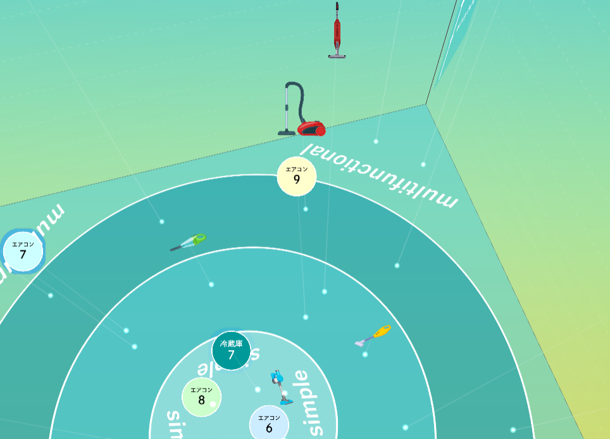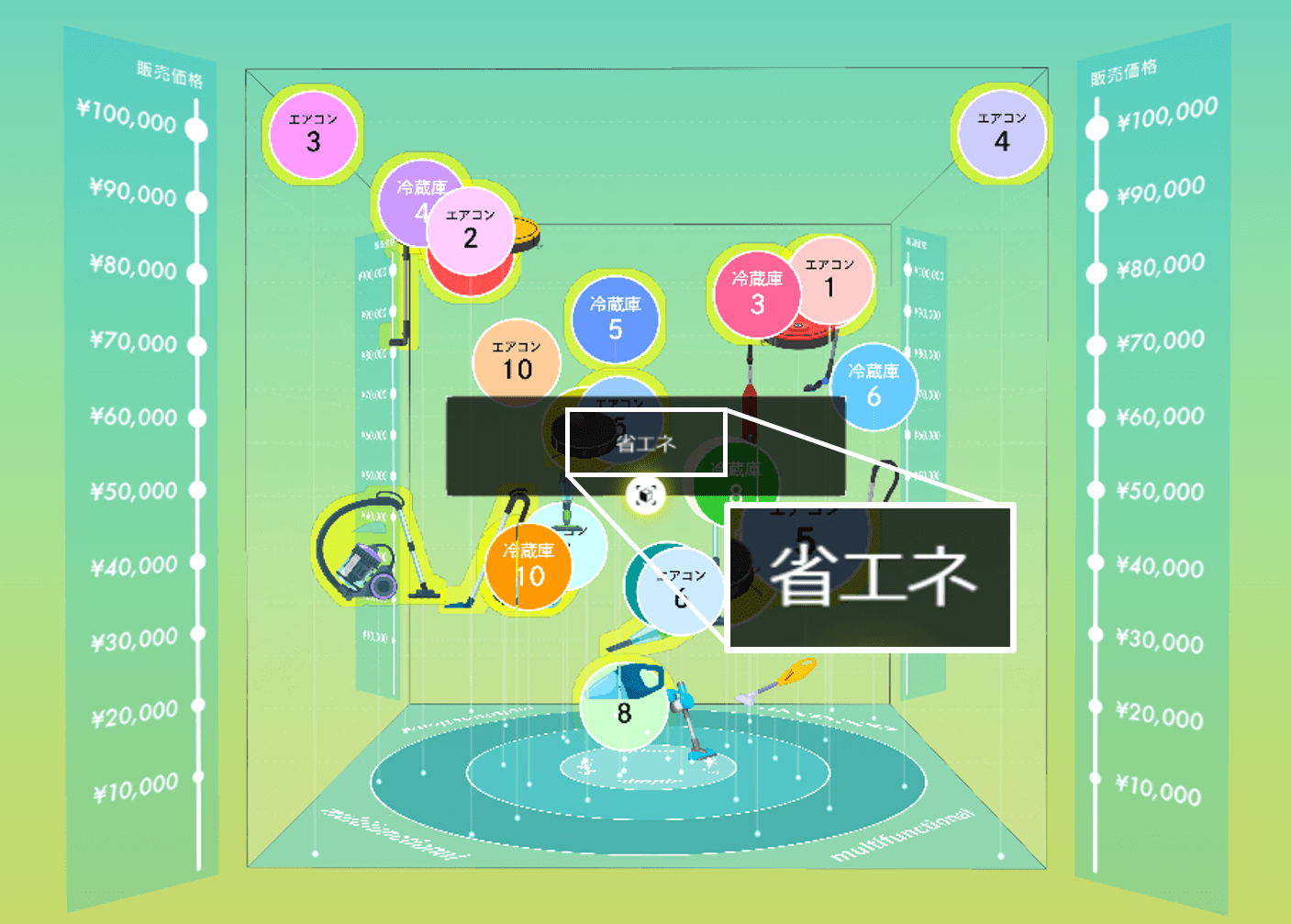 立体的な3D空間の中に商品を配置することで、相互の関係性をわかりやすく表現できます。例えば、キューブ(立方体)の縦軸に「価格」、底面に「機能分類」を置くことで、商品の価格感や商品比較がより直感的に把握できます。