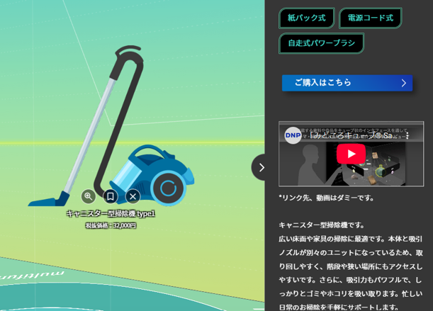 商品にフォーカスすることで商品の拡大画像を観たり、詳しい説明を見ることができます。またYouTube動画や個別ページへのリンクを埋め込むことも可能で、情報収集から商品購入のきっかけづくりをします。