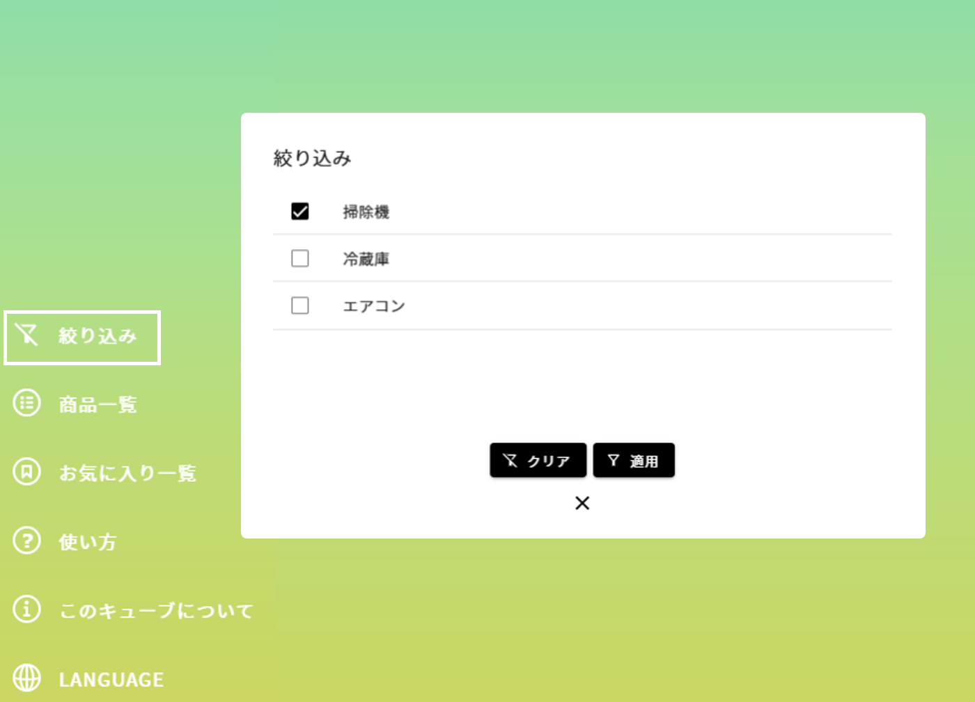 商品数が多い、商品のジャンルが多岐にわたるという場合に、絞り込み機能を使うことでキューブ内の商品を探しやすくします。
